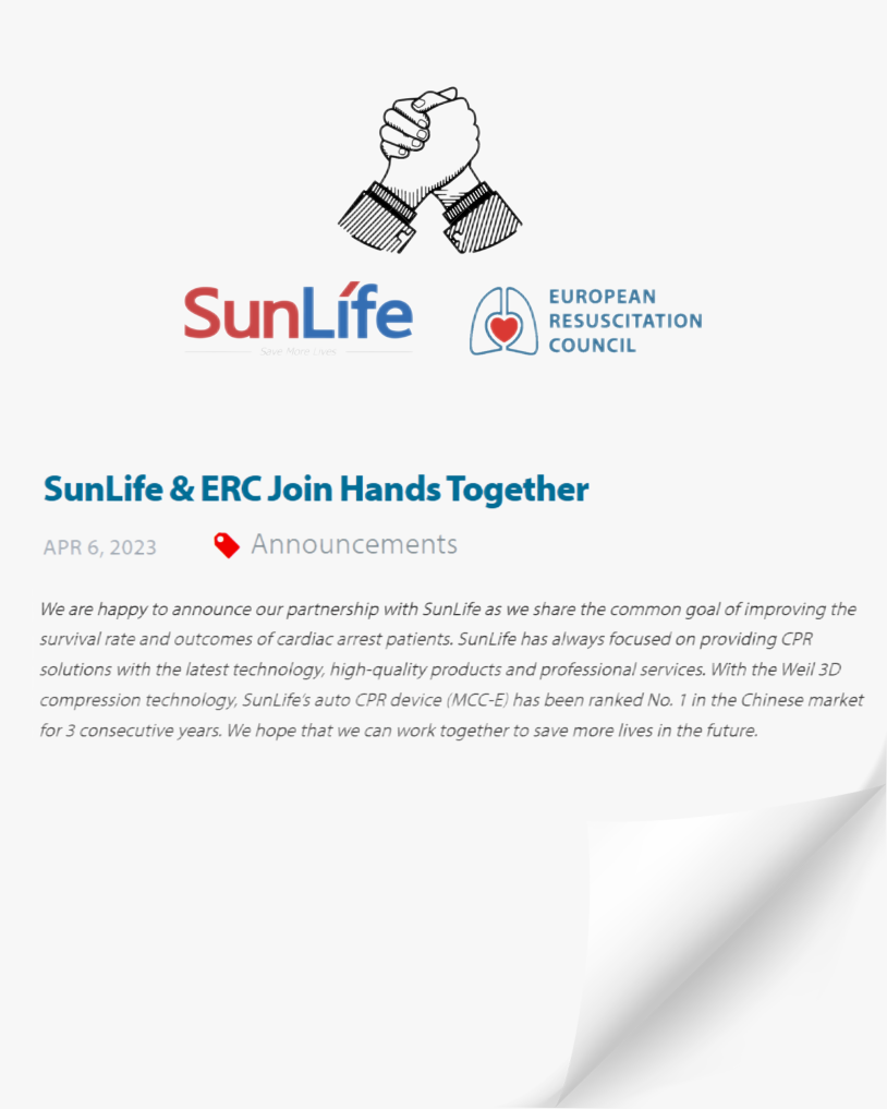 Sudden cardiac arrest is a global public health issue, yet the treatment remains a challenge. By developing CPR guidelines, ERC has built systematic resuscitation standards that lead the direction for high-quality CPR. SunLife is deeply engaged in the field of resuscitation and emergency medical production. With professional technologies, products and services, SunLife aims to be the leader in the resuscitation industry. In the business partnership, ERC and SunLife will have in-depth cooperation in clinical, research and academic fields that contribute to the development of high-quality resuscitation.