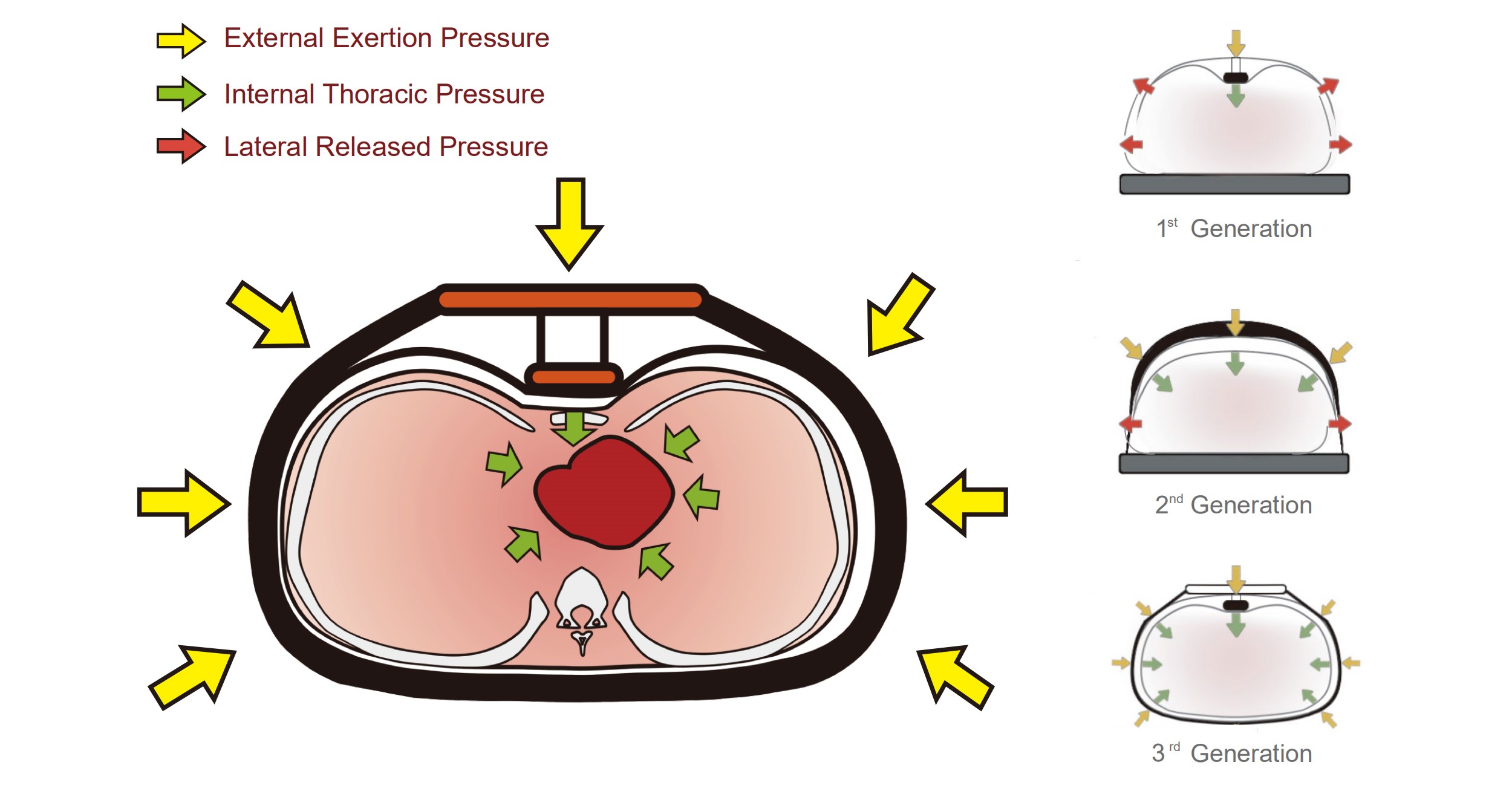 MCC-E uses “Weil 3D Compression Technology”, which originated from the world renown CPR institute, the Weil Institute. Combining the advantages of Piston CPR and Load-distributing CPR, Weil 3D Compression Technology increases the positive pressure and the negative pressure by intensify the deformation of the chest, which in turn generates more blood perfusion and decreases the risk of fracture.